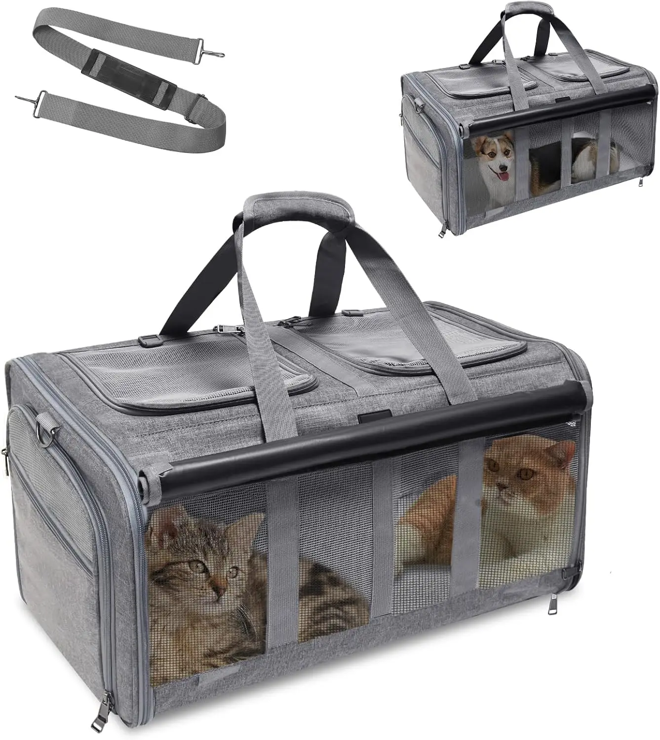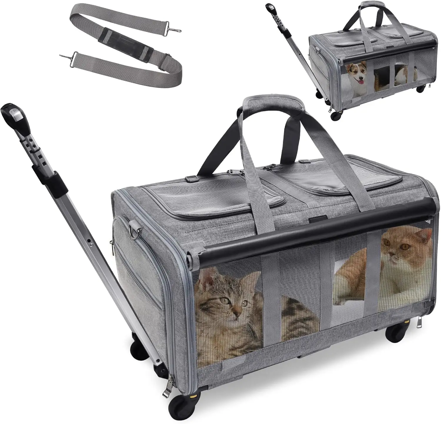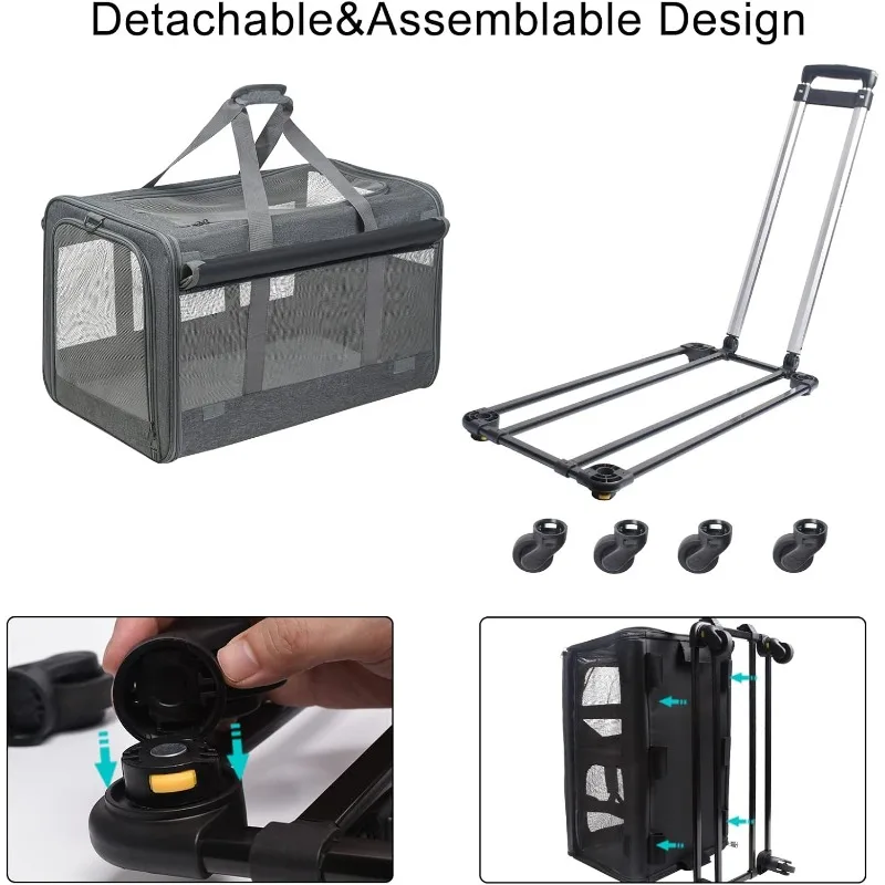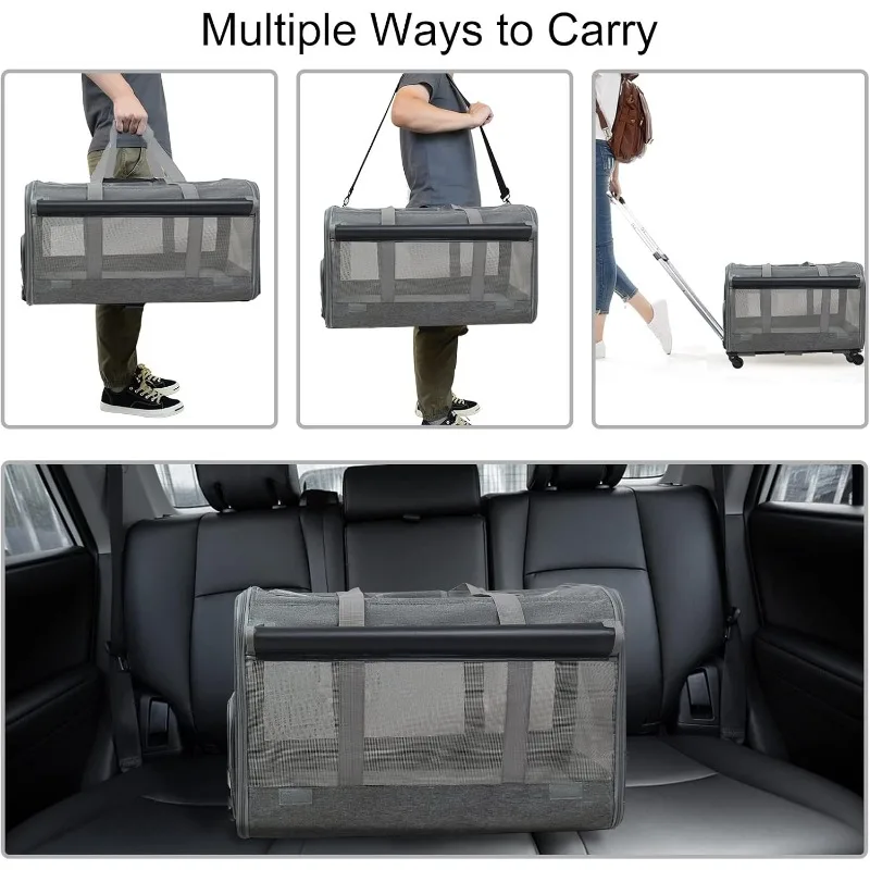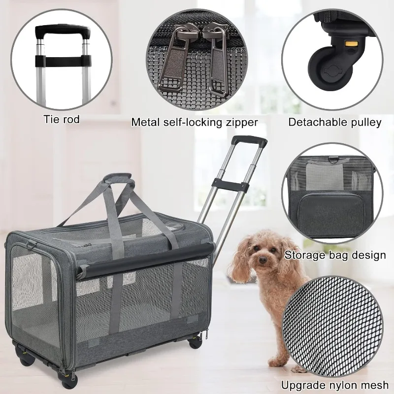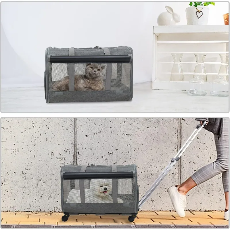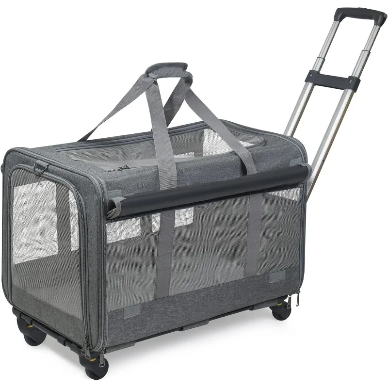 This Rolling Pet Carrier is designed to make traveling with your pet comfortable and stress-free. Built to support pets up to 30 lbs, it offers a sturdy yet lightweight structure for medium-sized dogs and cats. Smooth, flexible wheels provide effortless movement through airports, sidewalks, and busy areas. The breathable mesh panels ensure proper airflow and visibility, keeping your pet calm and comfortable. Its collapsible design allows for easy storage when not in use. Made from durable materials, it stands up to frequent travel and daily use. The spacious interior gives your pet room to sit, turn, and relax. Secure zippers and reinforced seams add extra safety during transport. Perfect for trips, vet visits, and everyday outings. Give your pet a smooth, comfortable ride with this practical rolling travel carrier.